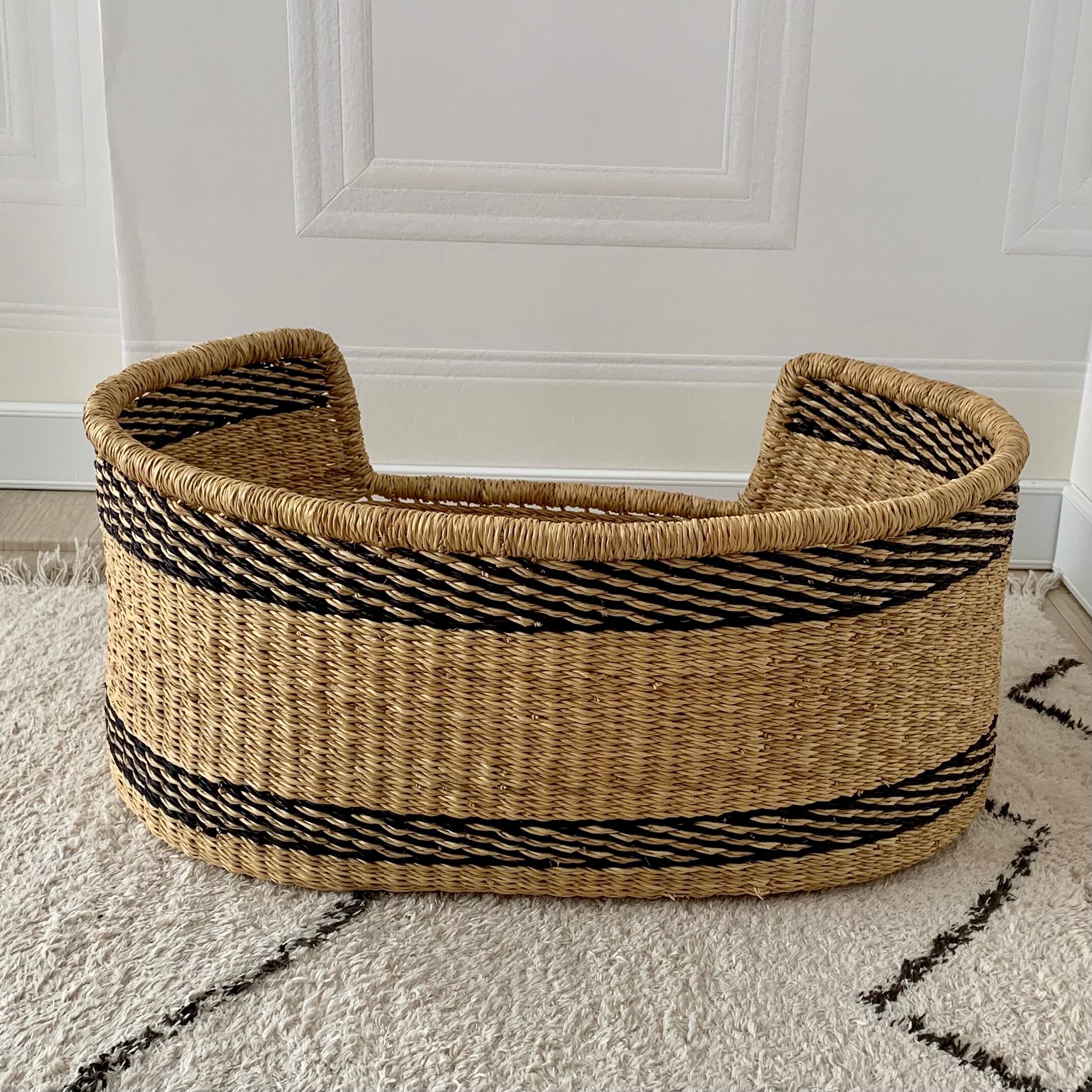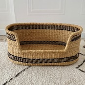 *オーバル(楕円形)の型に入り口がついたペットベッドバスケットです。ナチュラルカラーにブラックネイビー(限りなく黒に近いネイビー色)の網目模様が、上部と下部に入っています。スッキリとした印象があり大人っぽくもあります。