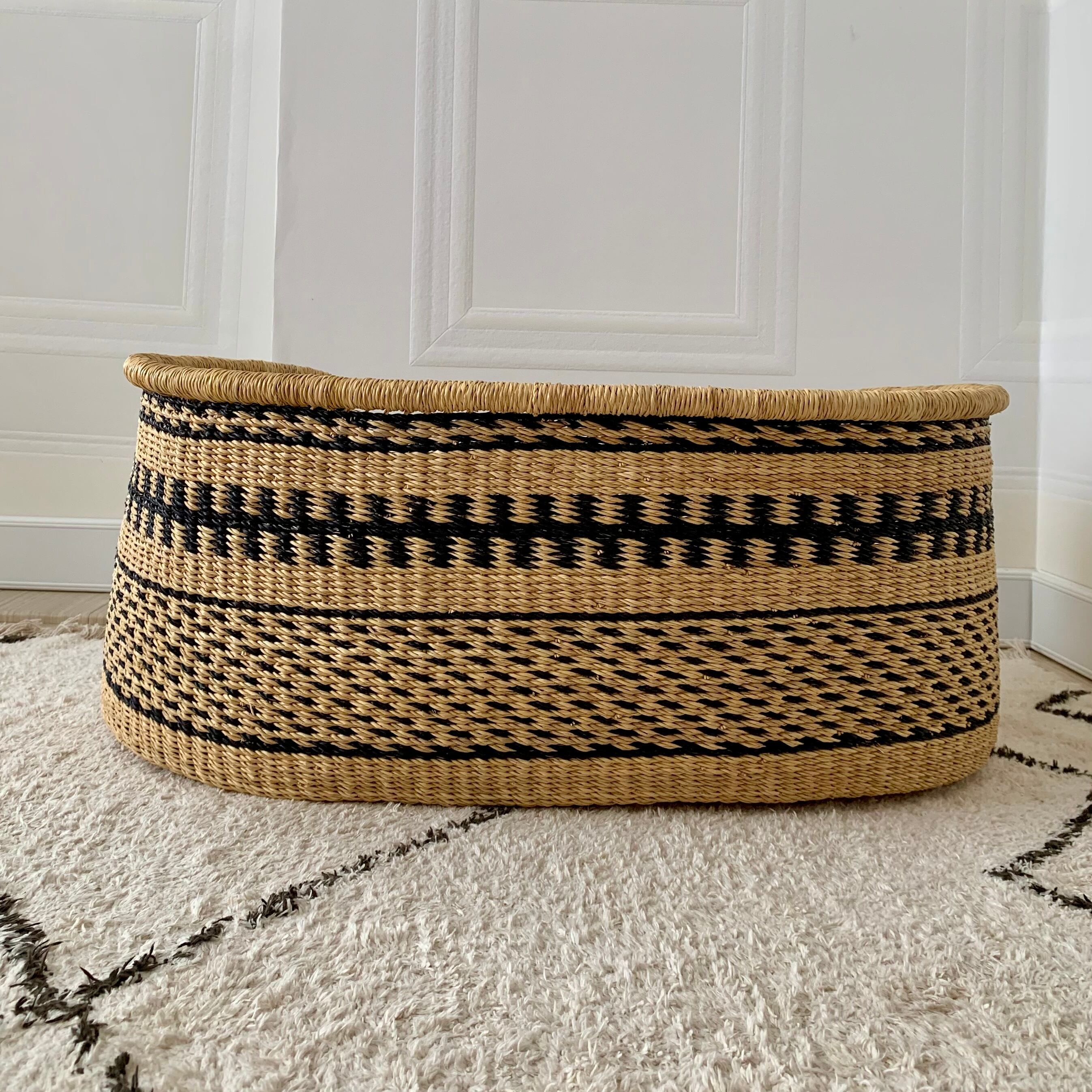 *オーバル(楕円形)の型に入り口がついたペットベッドバスケットです。ナチュラルカラーにブラックネイビー(限りなく黒に近いネイビー色)織込みがあります。上部には太めのラインの編み込みがあり、下半分はナチュラルカラーとブラック交互に編み込みがあり、ボルガバスケットらしさがあります。2色はナチュラルとブラックなので、シャープさもあり、モダンな印象があります。